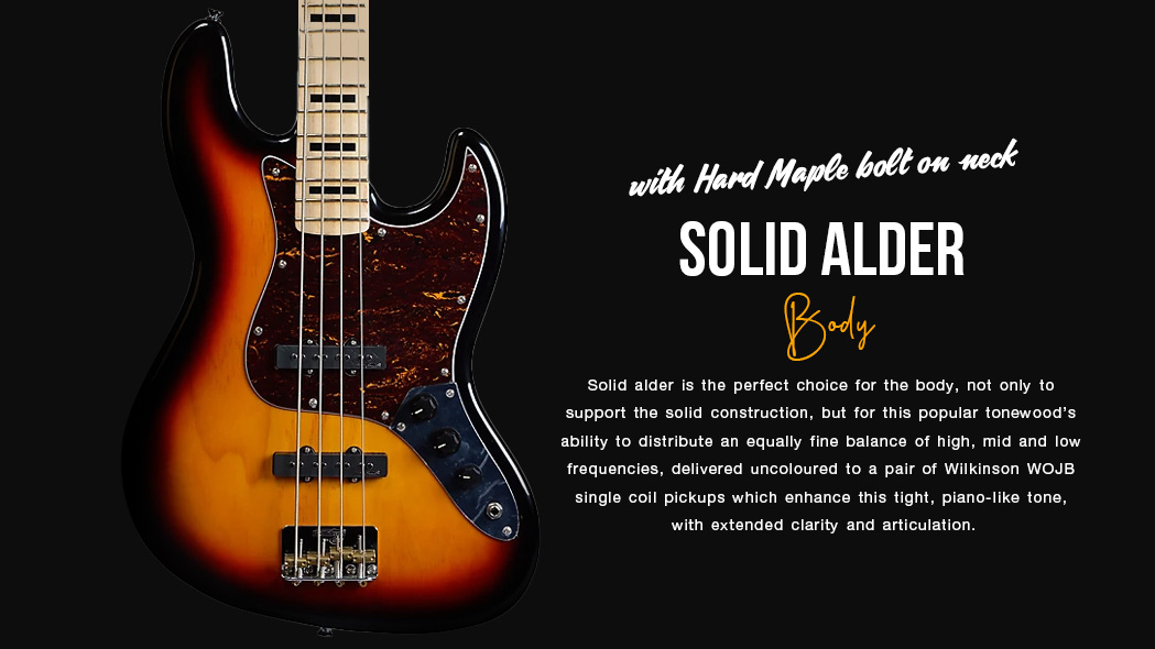 - Solid alder is the perfect choice for the body, not only to support the solid construction, but for this popular tonewood’s ability to distribute an equally fine balance of high, mid and low frequencies, delivered uncoloured to a pair of Wilkinson WOJB single coil pickups which enhance this tight, piano-like tone, with extended clarity and articulation.