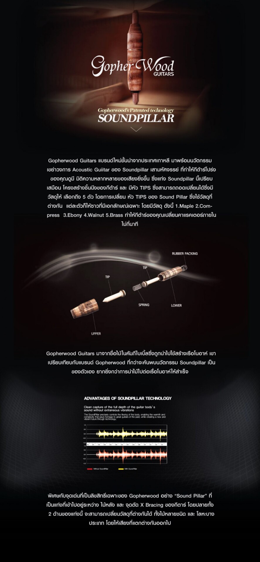 - และพิเศษกับจุดเด่นที่เป็นลิขสิทธิ์เฉพาะของ Gopherwood อย่าง “Sound Pillar” ที่เป็นแท่งที่เข้าไปอยู่ระหว่าง ไม้หลัง และ จุดตัด X Bracing ของกีตาร์ โดยปลายทั้ง 2 ด้านของแท่งนี้ จะสามารถเปลี่ยนวัสดุที่ต่างกันได้ ทั้งไม้หลายชนิด และ โลหะบางประเภท โดยให้เสียงที่แตกต่างกันออกไป