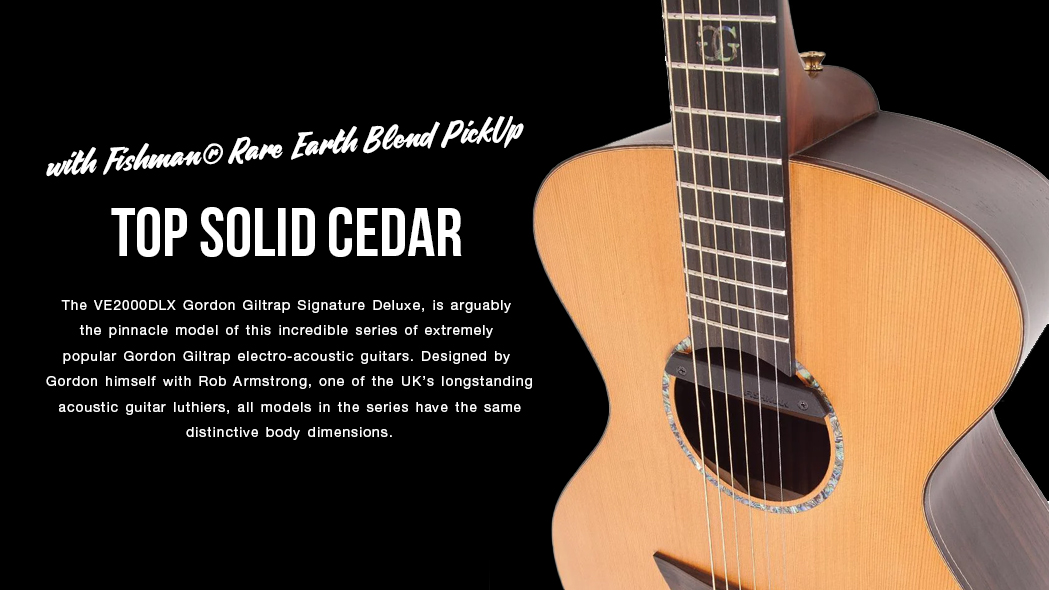 The VE2000DLX Gordon Giltrap Signature Deluxe, is arguably the pinnacle model of this incredible series of extremely popular Gordon Giltrap electro-acoustic guitars. Designed by Gordon himself with Rob Armstrong, one of the UK’s longstanding acoustic guitar luthiers, all models in the series have the same distinctive body dimensions.